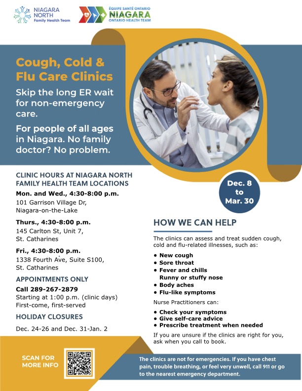 - The Niagara North Family Health Team operates After Hours Cough, Cold and Flu Care Clinics on the following days and times through March 30, 2026.