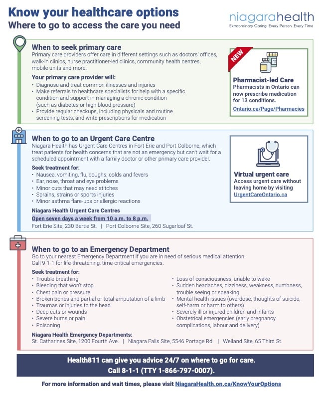 - Urgent Care Centres for issues that can’t wait for an appointment but aren’t emergencies. Open 10 a.m. to 8 p.m. daily in Port Colborne and Fort Erie. Make sure to check the Niagara Health website before visiting as hours are subject to change.